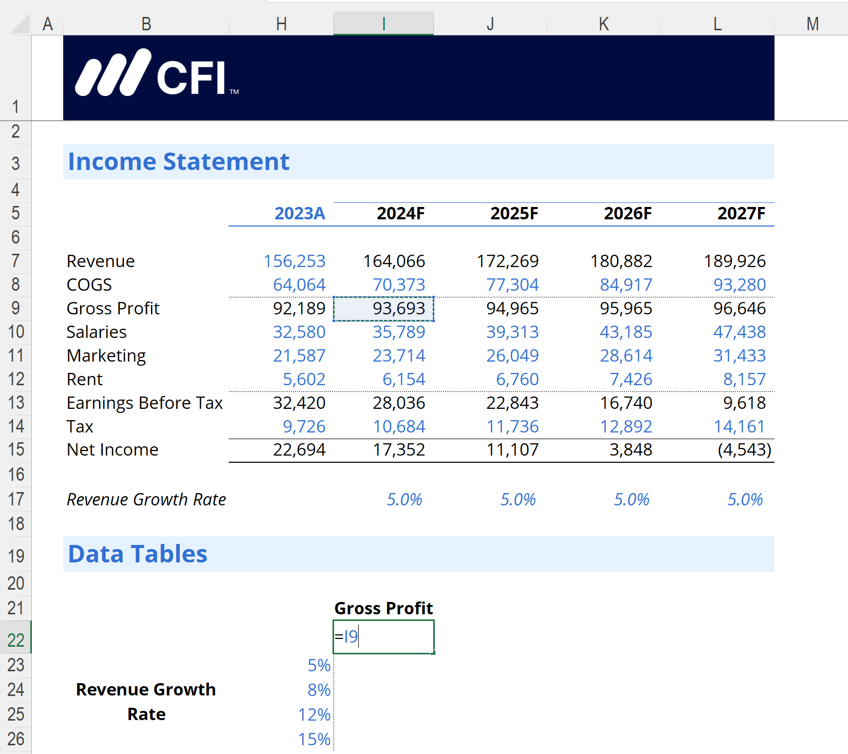 This formula takes the 2023 Revenue value and adjusts it by the growth rate shown below the Income Statement. This will update automatically when you run the Data Table.