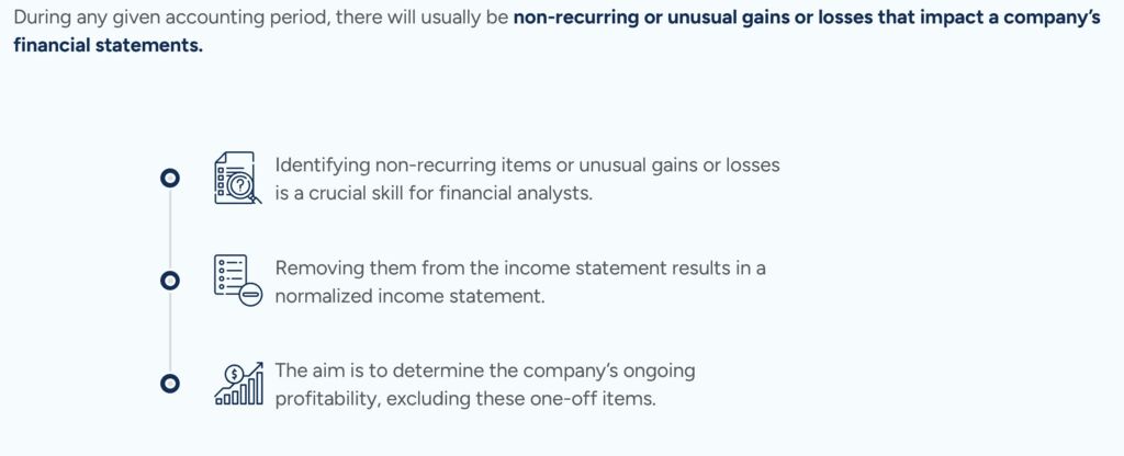 Unexpected, non-recurring items are bound to happen to any company. These can dramatically impact a company’s financial statements, skewing the underlying operating performance. Therefore, financial analysts need to be able to identify and adjust for these one-time items to better understand a company’s true performance. This course is perfect for anyone who uses and analyzes financial statements, including investment bankers, equity research analysts, and financial planning and analysis (FP&A) professionals.