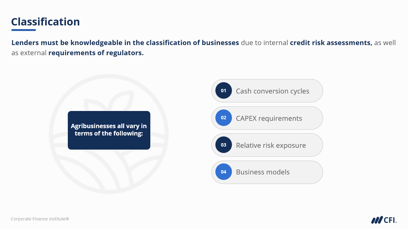 - Identify agricultural sub-sectors that financial services professionals are likely to come across.