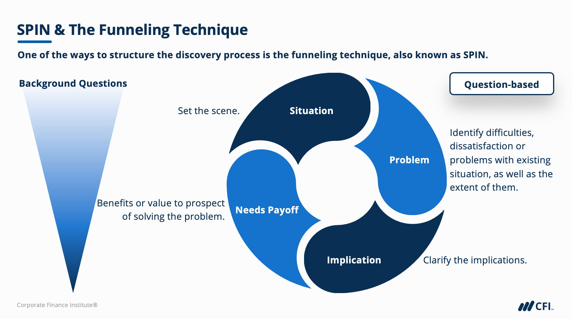 Next, we will seek to really understand the client discovery process and how to leverage it to uncover customers’ needs using unique frameworks, like the SPIN method and the funneling technique.