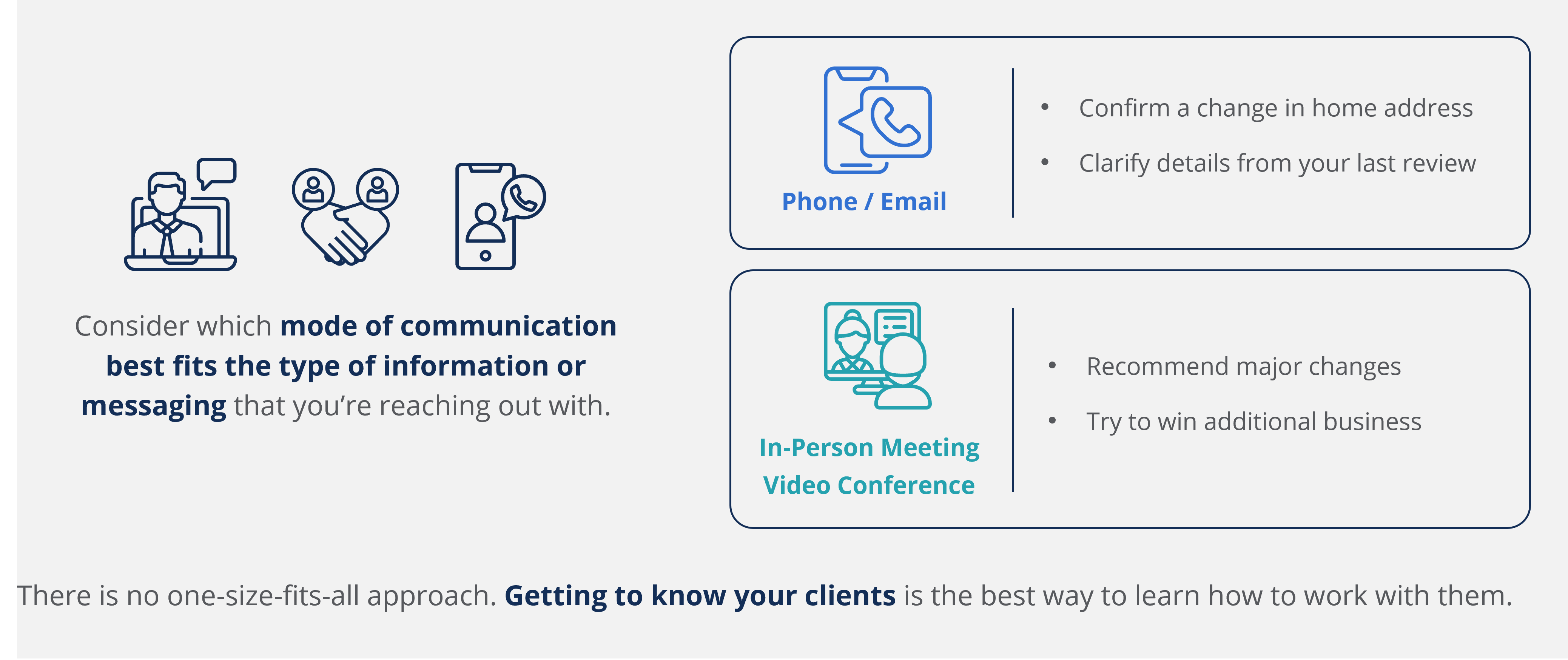 Being a successful advisor is a long-term game. Developing the skills to connect with and deeply understand clients will allow you to form trusting, long-term client relationships that successful practices are built on. While learning effective communication skills requires more open-ended discussion and less procedural instruction, it is just as important as financial statement analysis if you want to be a successful advisor.