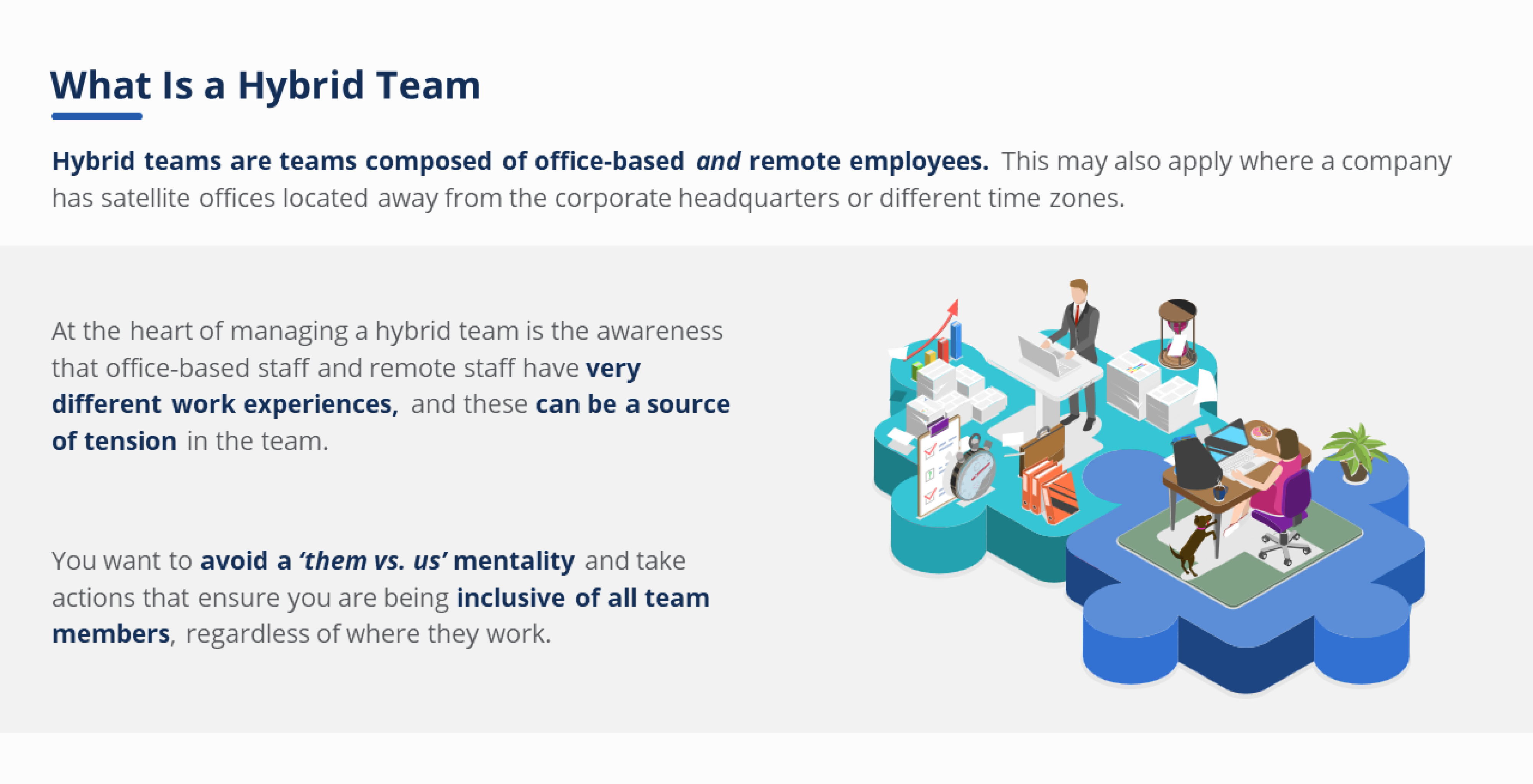 In this course, we will explore Tuckman’s Team Development Model and introduce approaches and strategies, including assessments that can be used with your teams. We will outline the 6 characteristics of high-performing teams that need to be in place to ensure business results, and finally, we will explore the challenges that leaders may encounter when managing hybrid teams. You will be introduced to some strategies and approaches to improve productivity and output that ensure all team members feel engaged and included.
