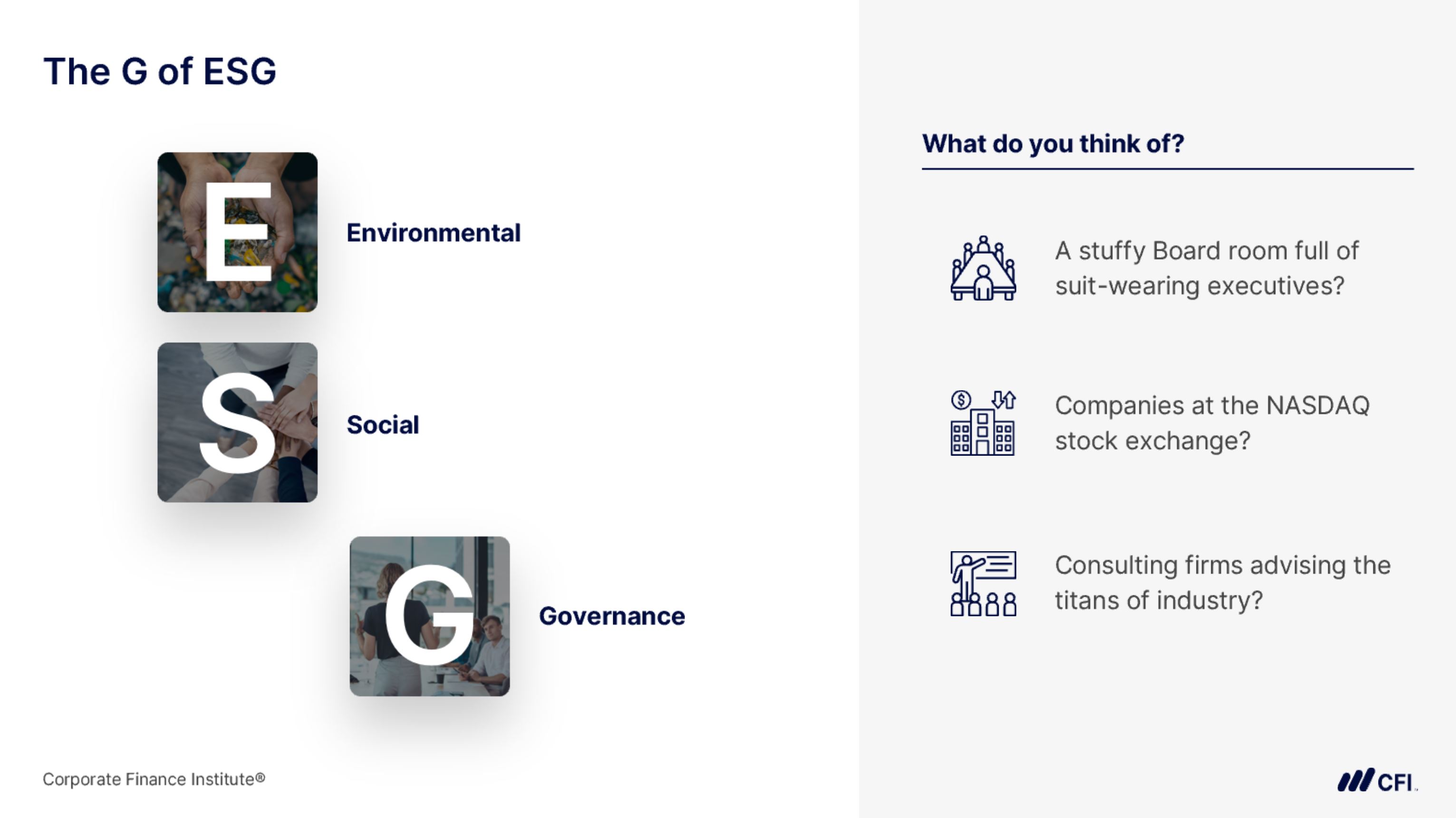 In CFI’s “governance Issues & Materiality” course, you will explore key governance challenges such as board composition, enterprise risk management, ethics, and compliance, and their material impact on a company’s financial performance and long-term success. Additionally, the course provides practical guidance on how businesses can prioritize governance issues based on stakeholder consensus, risk likelihood, and the needs of major investors and customers, ultimately helping companies navigate the complex landscape of modern corporate governance.