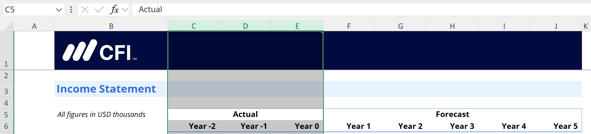 Center Across Selection in a Dashboard. Source: CFI’s 3-Statement Modeling course.